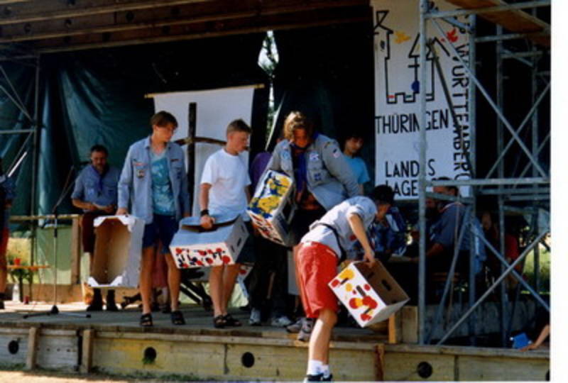 **Die 600-Seelengemeinde Harras unweit von Hildburghausen in Südthüringer war der Schauplatz des Geschehens. Ein kahles Feld der in Harras ansässigen Milchland GmbH verwandelten die Scouts binnen weniger Tage zu einer Zeltstadt mit ungefähr 300 Jurten und Kothen (große schwarze Zelte). Eine Bühne, Marktplätze, mehrere Oasen für kühle Drinks, ein Haik- und Reisebüro, eine eigene Lagerzeitung, ein Kiosk, ein Lagermarkt, eine gut strukturierte Verwaltung und natürlich Waschzelte und Dixi’s (Toiletten) machten das Lager wohnlich. Natürlich sollte keine lange Weile aufkommen, und so sorgte die Aufgabe, Ritter Harras, der wegen seiner schlimmen Taten von einem Gnom verflucht wurde, zu befreien, zu einigen Aktionen. Denn die Befreiung war laut Sage nur möglich, wenn junge Menschen aus aller Herren Länder gemeinsam eine “Burg” errichten und darin friedlich leben. So gab es dann auch mehrere Unternehmungen, um das Ziel zu erreichen. Neben gleich mehreren Burgen (darunter ein Nachbau der Matthisburg aus “Ronja Räubertochter”) aus dem schwarzen Zeltstoff, Türmen und Toren gab es genügend Gelegenheiten ein friedliches Zusammenleben zu erreichen. So wurden Ausflüge (z.B.: Kanutouren, ein super Geländespiel, Sportwettkämpfe, Kreative Shows (Marke Eigenproduktion) und Singe bzw. Theaterwettstreite seitens der Lagerleitung veranstaltet. Aber auch die einfachen zwischenmenschlichen Beziehungen konnten viele Vorurteile zwischen Ost und West beseitigen. Mit guten Gefühlen und der Sehnsucht auf ein neues Lager ging dann das Lager zu Ende.