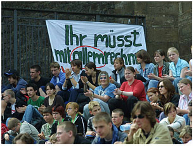 Als Mitglied der Evangelischen Jugend Gotha gestalteten Benjamin, David, Christoph und Hendrik als Helfer den Jugendkirchentag rund um die Predigerkirche mit. “Rechenzentrum” hieß das Projekt, an dem die Gothaer zusammen mit JG’s aus Meiningen, Gera, etc. die Besucher auf verschiedenen Stationen und Wegen im Ratsgymnasium mit Gott abrechnen ließen. Dabei galt es auch die persönliche Beziehung zu Gott herauszufinden. Neben dem Projekt blieb genügend Zeit, die anderen Angebote des Kirchentages zu besuchen. Dazu gehörten der Besuch von Konzerten, Gesprächsrunden und Gospelchor genauso, wie ein Abstecher in das Pfadicamp des VCP-Thüringen oder der Besuch der Wahlkampfkundgebung der Grünen mit Joschka Fischer auf dem Anger. Am Sonntag wurde der Thüringer Kirchentag mit mehreren Gottesdiensten, wie dem Jugendgottesdienst auf dem Fischmarkt abgeschlossen. Bleibt zu sagen, dass sich außer der grausamen Verpflegung und ein paar zu wenigen Besuchern der Kirchentag “gerechnet” hat.