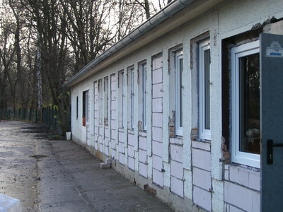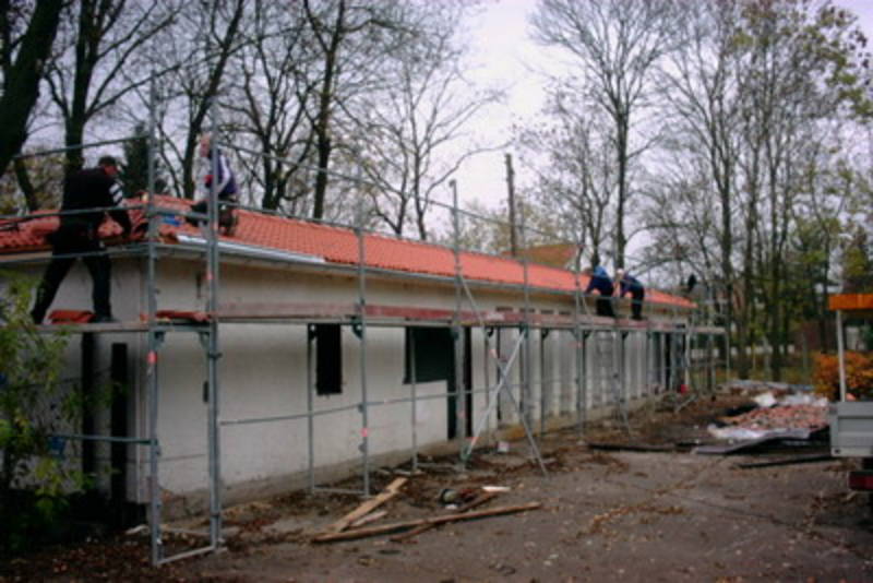Die Dachdeckerarbeiten auf dem zukünftigen Stammeshaus (Hauptgebäude) und dem Materialschuppen sind weitestgehend abgeschlossen. Jetzt folgen die Mauerarbeiten sowie das Einsetzen der Fenster und Türen am ehemaligen Umkleidegebäude, um die Außenhaut bis Ende November , wie geplant, schließen zu können.