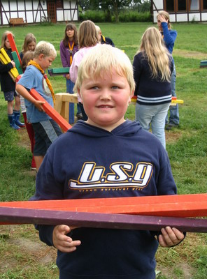 Für die älteren Pfadfinder ist „Learning by doing“ Alltag. Johannes Hoffmann (15) fand das bei einer Sippenfahrt nach Russland heraus: „Als es nachts regnete, stand unser Zelt unter Wasser. Abhilfe schafften Gräben rund ums Zelt. Das Essen war nur mit peinlicher Hygiene genießbar“. Die deutschen Pfadfinder trafen sich dort mit Kollegen vieler Nationen. Englisch oder Gebärdensprache führten schnell zueinander. Im Thüringer Verband christlicher Pfadfinder (VCP) gab es indes Verständigungsprobleme. Die Mitglieder der Gruppe Neudietendorf Gotha stiegen im Juni 2004 aus dem VCP aus und bildeten im Oktober eine neue Gruppe „Drei Gleichen“ im interkonfessionellen Pfadfinderverband. „Wir wollten mehr Spielräume“, meint Gruppenchef Hendrik Knop. Wolfgang Loh, VCP-Projektleiter für Ostdeutschland, will die Pfadfinder experimentieren lassen: „So eine Trennung gehört in der Jugendbewegung einfach dazu“. Man arbeite ja trotzdem zusammen, etwa bei der Aktion „Friedenslicht“, die zu Weihnachten an christliche Nächstenliebe erinnert. In Neudietendorf hat die neue Gruppe Fuß gefasst, versichert Knop: „Die Gemeinde schätzt unsere Jugendarbeit. Nicht von ungefähr konnten wir jetzt das alte Freibad für 25 Jahre kostenfrei mieten“. Der Jugend im Ort etwas Sinnvolles für die Freizeit anzubieten sei aber schwer. Deshalb setzten sich die Vereine an einen Tisch und gründeten den Kinderund Jugendring Neudietendorf. Der Nachwuchs der evangelischen Jugend Gotha, der Feuerwehr, des Sportklubs und des Trachtenvereins trifft sich regelmäßig mit den Pfadfindern, feiert zusammen das Kinderund Jugendfest. Schul-Turnhalle und Johanneskirche bieten Freiräume für Spiel und Musik. Die waren für einige Andere offenbar nicht groß genug: Sie zertrampelten Blumen und Vasen auf dem christlichen und auf dem kommunalen Friedhof der Kleinstadt (TA berichtete). Eine Zeugin will drei Jugendliche am Tatort gesehen haben. Geschockt zeigt sich Knop: „Denen sollte man eine Schaufel in die Hand drücken, damit sie den Mist in Ordnung bringen“. Manche Jugendliche, gerade von außerhalb, lungerten an Bushalten herum und kämen auf dumme Gedanken. Alle zu erreichen überfordere aber die Pfadfinder: „Da müssen Streetworker ran. Was wir machen, sind Fahrten zu Gedenkstätten, um unseren Pfadis Werte und Achtung zu vermitteln“. In den nächsten drei Jahren helfen die Spenden der Aktion Mensch. Aus dem Schwimmbecken entsteht ein Riesen- Schachbrett mit selbst geschnitzten Figuren. Auch ein Baumhaus und ein Naturlehrpfad wächst unter den Händen der Naturfreunde.