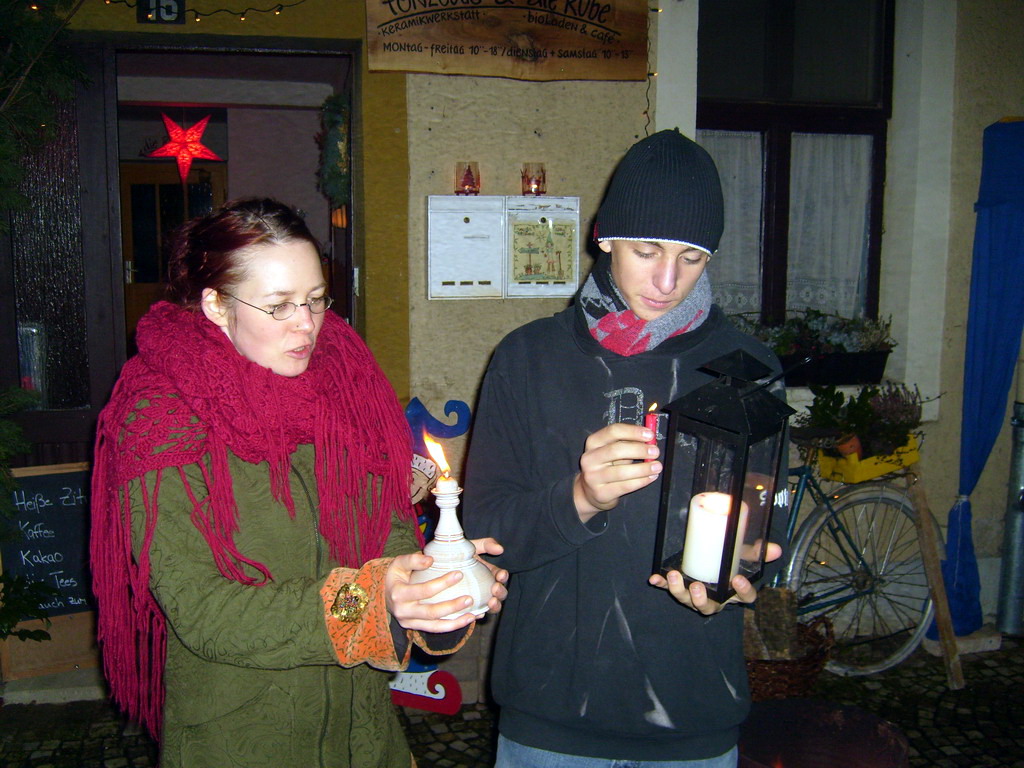 Sebastian Neitzel bei der Übergabe des Friedenslichtes in Neudietendorf an Rita Wulf für den Bioladen „Die Rübe“ und „Tonzeugs“ am 23.12.2006, nachdem er die Flamme mit seiner Gruppe in Thüringen via Bahn verteilt hatte