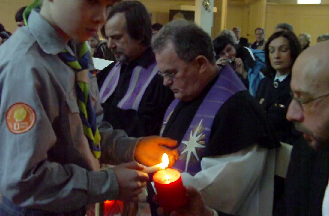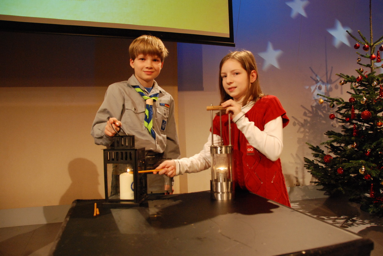 **Ein Kerzenlicht fährt mit der Feuerwehr am Saal der Herrenhuter Brüdergemeine vor. Schon das muss manchem am Morgen des 23. Dezember ungewöhnlich vorgekommen sein. Ein Junge steigt aus und hält in den Händen eine Laterne: Pfadfinder Clemens Riese, er ist das Friedenslicht-Kind und hat seit Tagen das besondere, in der Geburtsgrotte von Bethlehem entzündete Weihnachtssymbol bewahrt. **