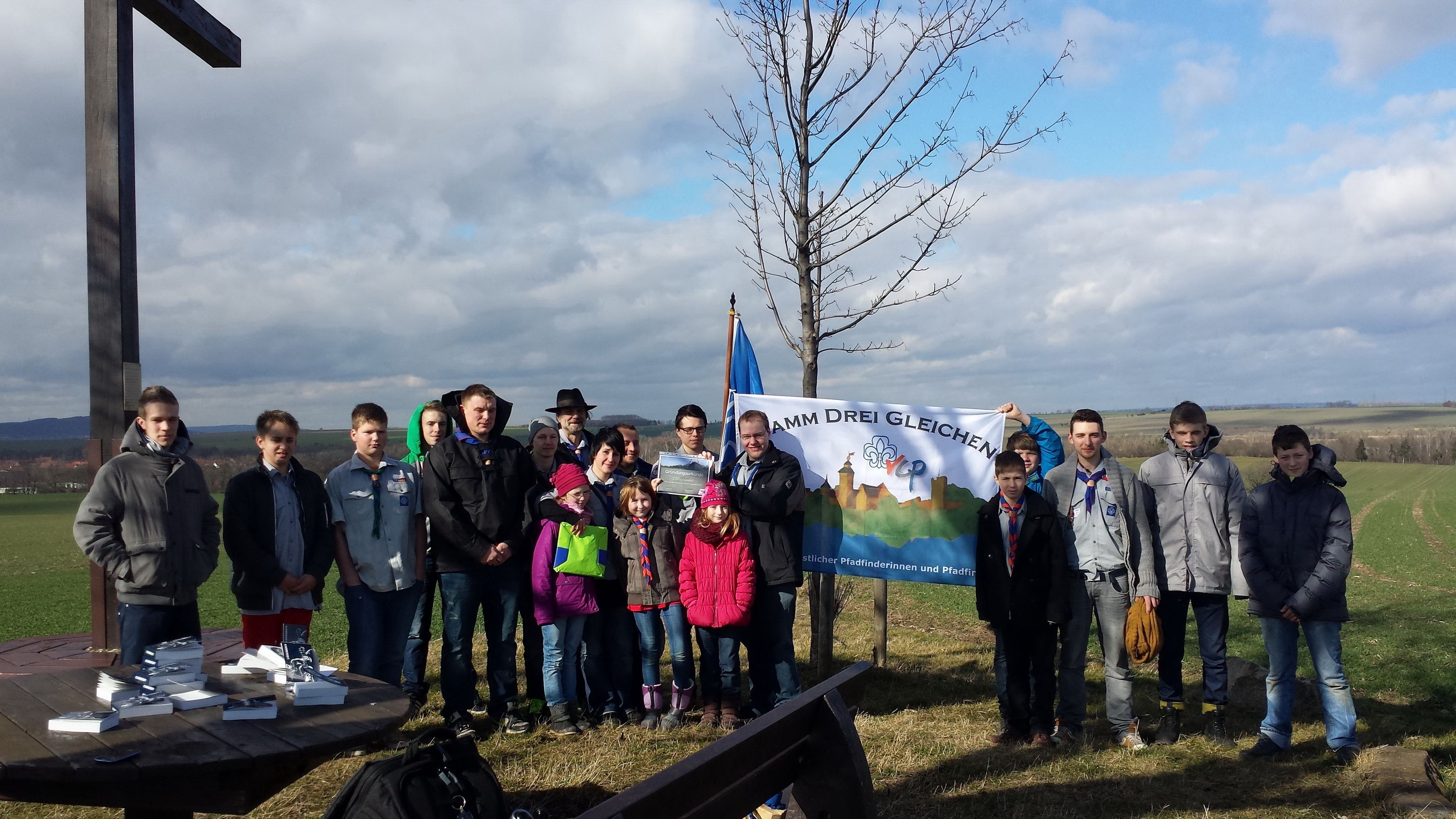 **Am 22. Februar 2014 wurden die Mitglieder des neu gegründeten Stamm Drei Gleichen aus Nesse-Apfelstädt von Andreas Richter als Teil der Landesleitung des VCP Mitteldeutschland am Kummelkreuz Kornhochheim durch Überreichung einer Urkunde in den Verband Christlicher Pfadfinderinnen und Pfadfinder aufgenommen. Rund 20 Mitglieder unter der Stammesleitung von Sabine Währisch, Scott Quade, Benjamin Schneider, Udo-Wich Heiter und Pfarrer Michael Göring nahmen diese mit dem Versprechen entgegen, auch in Zukunft die Ideen der internationalen Pfadfinderbewegung miteinander umzusetzen. Den richtigen Tag hierfür hatten die jungen Scouts gewählt. Schließlich feierten mit ihnen zusammen weltweit alle Pfadfinderinnen und Pfadfinder den sogenannten „Thinking Day“, den Gedenktag zu Ehren des gemeinsamen Geburtstages der Gründer Robert und Olave Baden Powell am 22. Februar. **