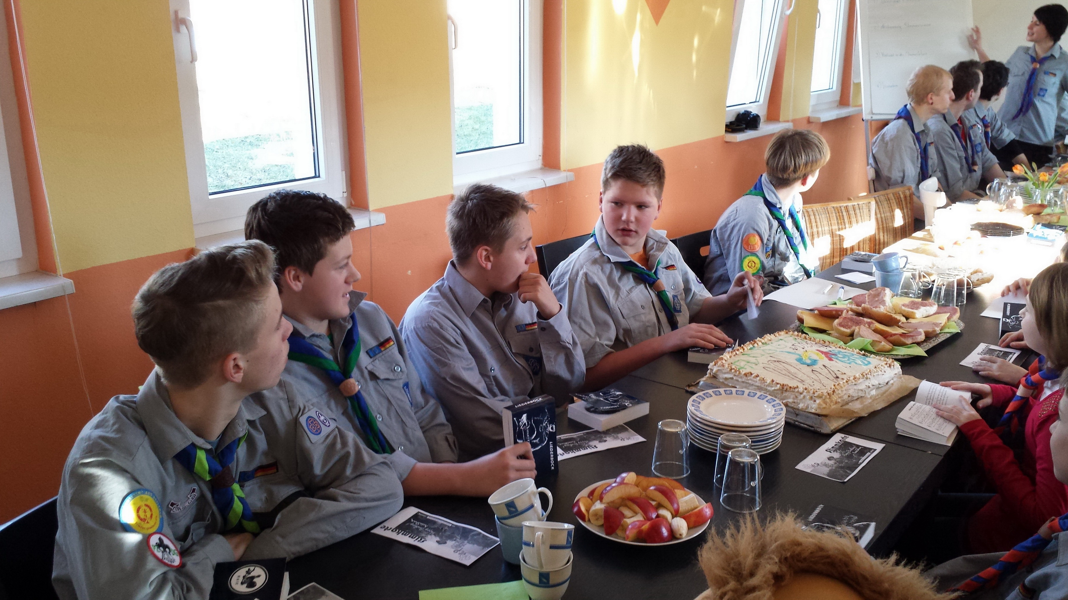 Mit einer Stammesversammlung um 10 Uhr begann für die christlichen Pfadfinderinnen und Pfadfinder der Samstag im Pfadfinderzentrum Neudietendorf der Gemeinde Nesse-Apfelstädt. Hier wurde bei einem gemeinsamen Frühstück mit Geburtstagstorte, belegten Brötchen sowie Tee und Kaffee über den Stammesnamen abgestimmt, wobei sich „Stamm Drei Gleichen“ gegenüber „Stamm fleißige Waidbauern“ und „Stamm Neudietendorf“ durchsetzen konnte. Außerdem wurde in einer Wahl die bereits im September gewählte Stammesleitung um ein Mitglied ergänzt. Im Anschluss führte eine Wanderung unter dem Banner des VCP zum Kummelkreuz in Kornhochheim, um hier die Aufnahmefeierlichkeiten durchzuführen. Unter den Gästen waren hier auch Vertreter der „Gilde Drei Gleichen“, den Erwachsenenpfadfindern des Verbandes Deutscher Altpfadfindergilden e.V., um dem Stamm als Geschenk eine Stammesfahne zu überreichen. Zurück im Pfadfinderzentrum wurde die Aufnahme nach einem zünftigen Mittag, an dieser Stelle ein großes Dankeschön an das Küchenteam der Altpfadfindergilde, mit „Tschai“ beschworen.