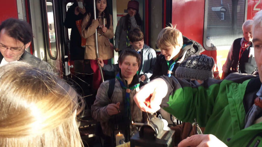 Mit den Thüringer Bahnen erreichte das Friedenslicht aus Betlehem ganz Thüringen: Pfadfinder Aaron Friedrich und Jean-Pierre Piethe (v.l.n.r.) bei der Weitergabe des Friedenslichtes am Weimarer Hauptbahnhof
