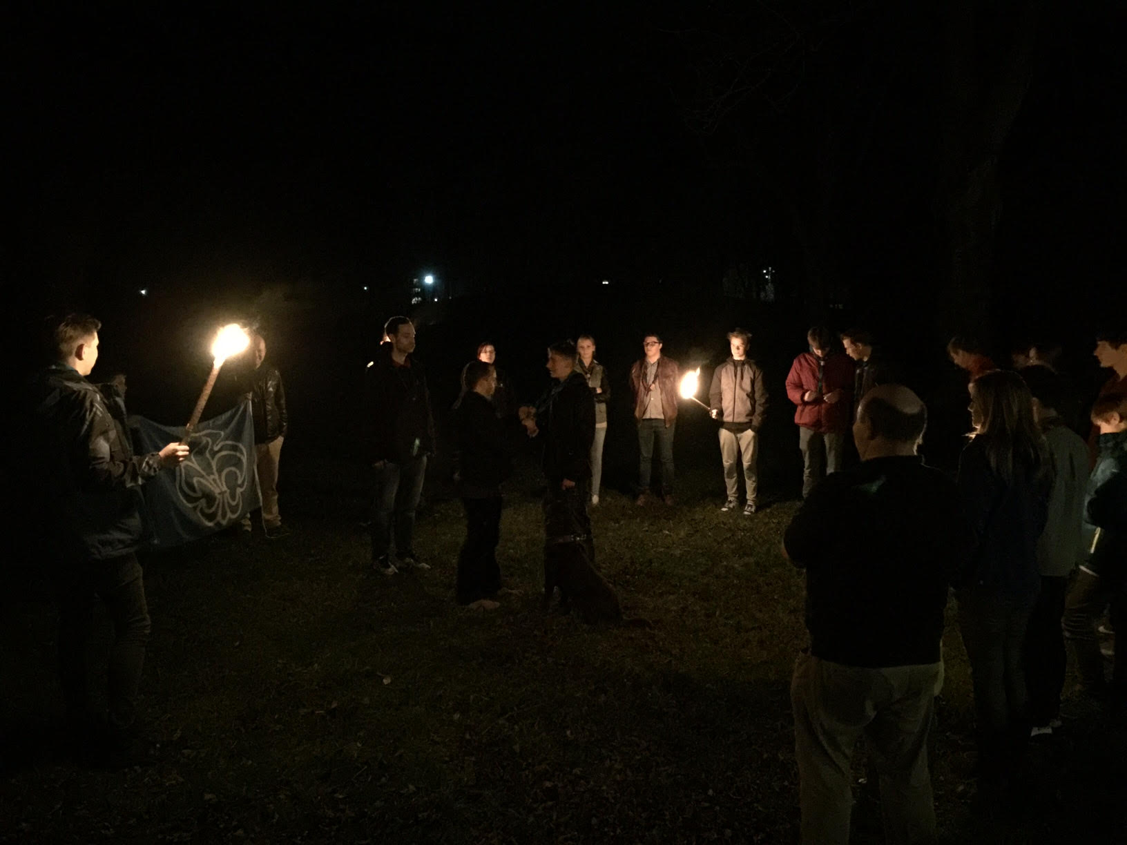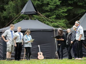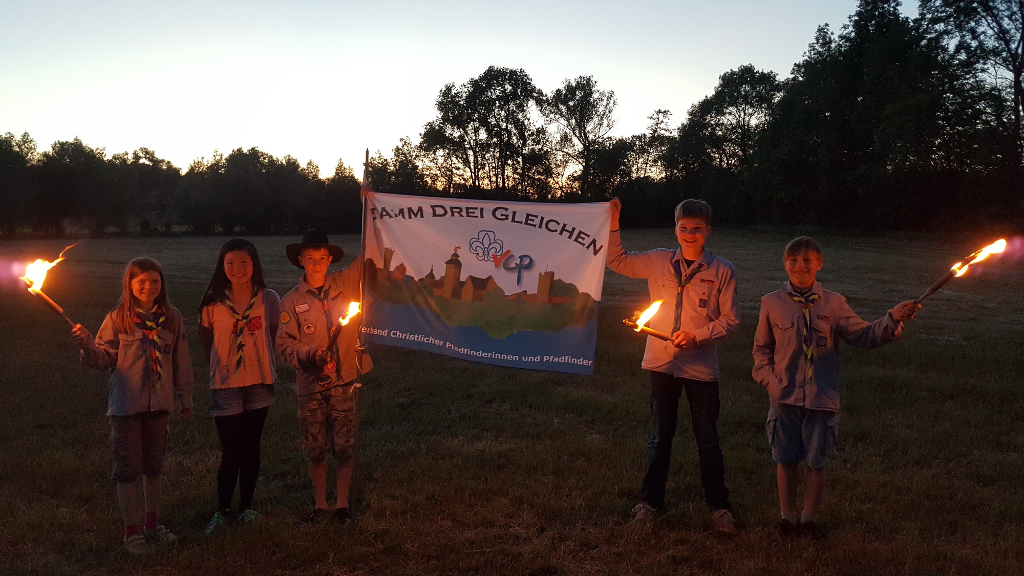 Umso aufgeregter waren die jungen Pfadfinderinnen und Pfadfinder auch, als sie sich am Samstag, dem 13. Juni 2015 im Neudietendorfer Pfadfinderzentrum zu ihrem Sippenlager einfanden, um hier eine Nacht zu zelten. Gerade noch als Helferinnen und Helfer zum Sommerfest der Evangelischen Kindertagesstätte „Arche“ mit Stockbrot und Lagerfeuer im Einsatz, ging es jetzt darum, das eigene Essen zu kochen und die Zelte noch einmal abzuspannen. Als Belohnung hatte Sippenführer Clemens Riese eine Überraschung parat. Ausgestattet mit Fackeln und Stammesfahne ging es mit einem Schweigemarsch auf eine entlegene Wiese zwischen Apfelstädt und Neudietendorf. Hier erhielten Ngoc Tran Bao und Vincent Niessner im Rahmen einer Aufnahme ihr Halstuch, während Cosima Riese ihren Stufenübergang von den Wölflingen zu den Jungpfadfindern mit einem Halstuchwechsel feiern konnte. Das ganze wurde natürlich anschließend am Lagerfeuer mit einer „Tschai-Beschwörung“ (Tschai ist ein heißes Pfadfindergetränk) gefeiert und der Abend konnte mit dem Singen ausklingen, bevor das Sippenlager nach einer trockenen Nacht im Freien und dem Frühstück sein Ende fand.