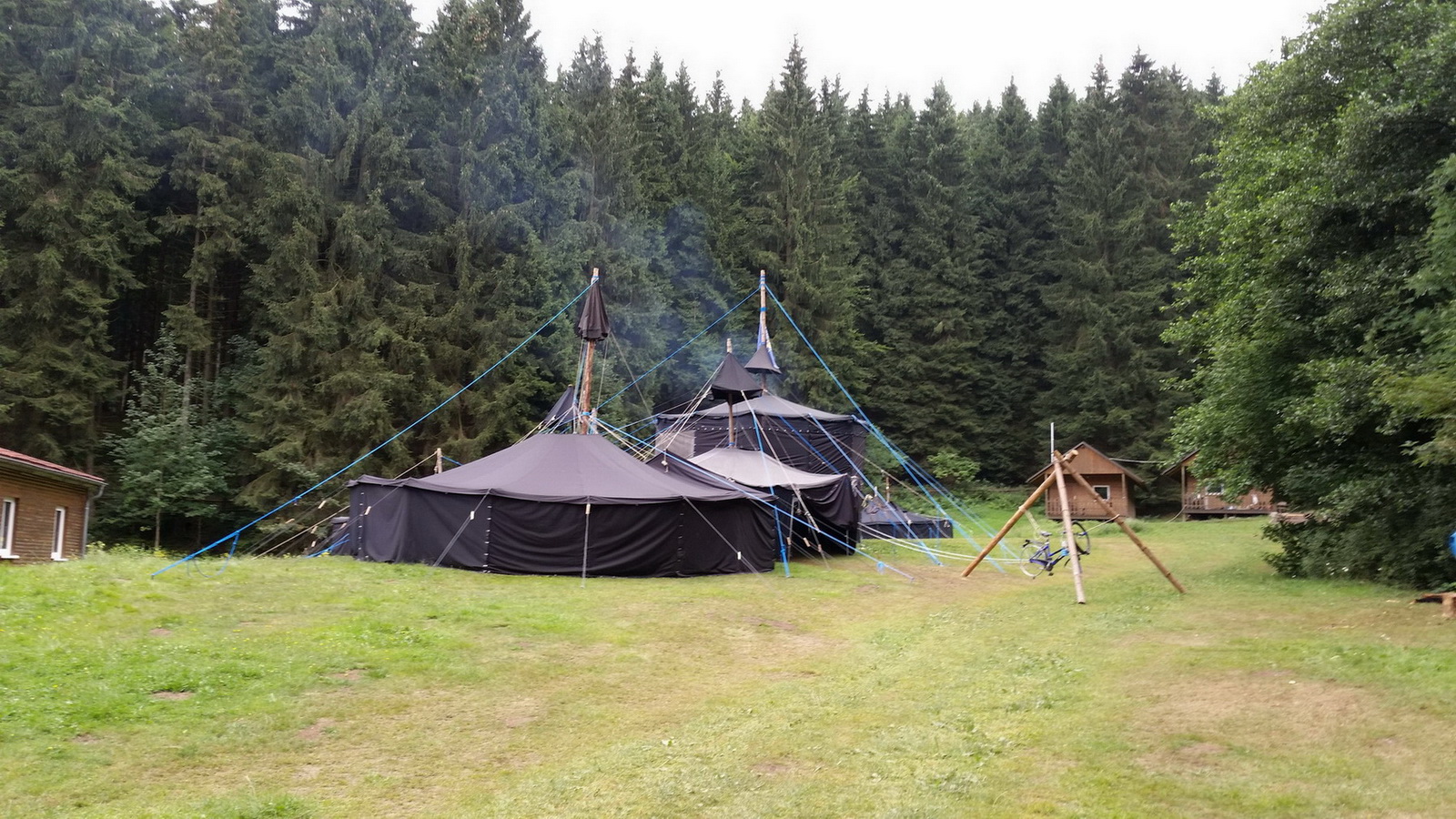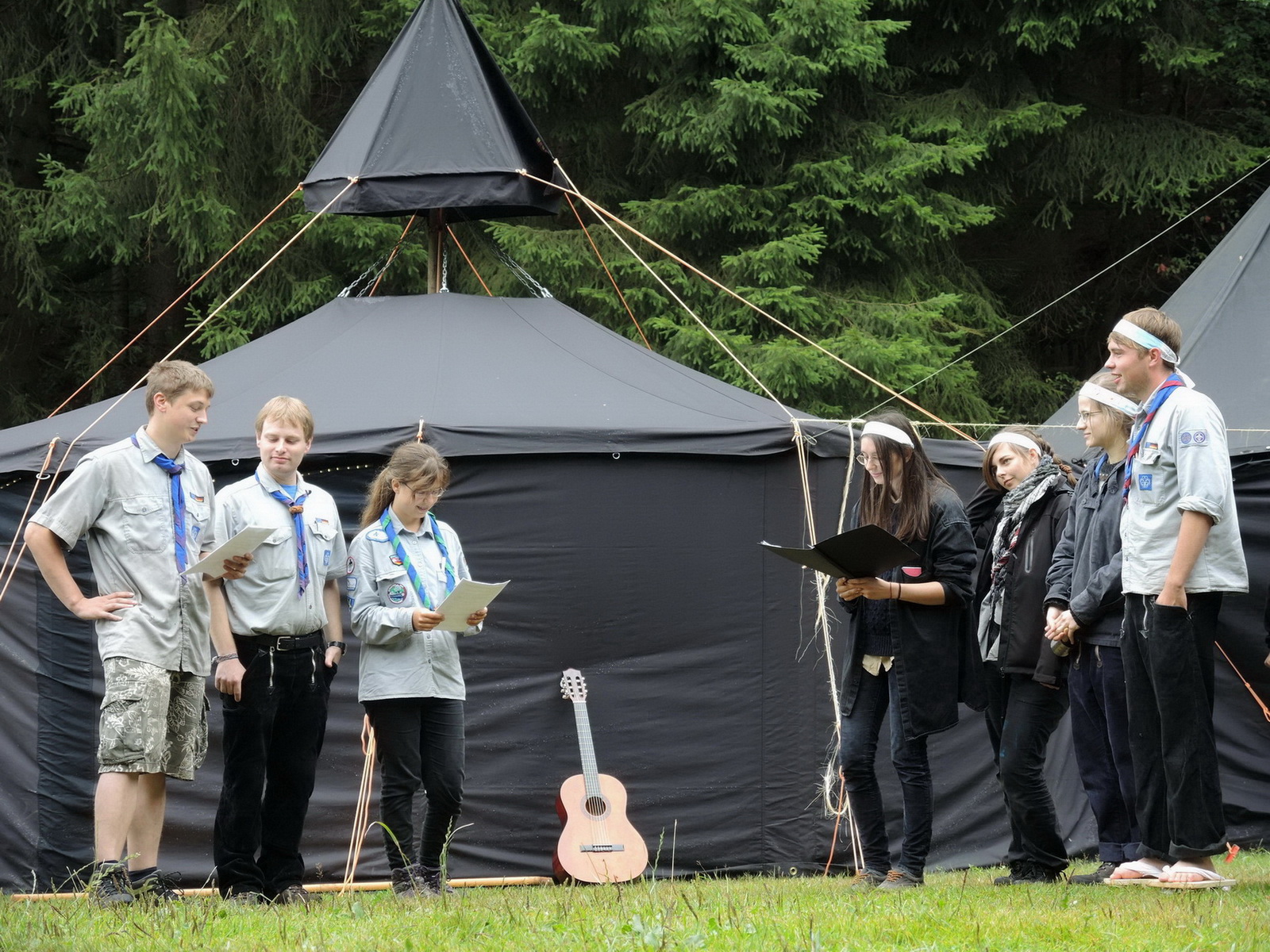 Wer Richtung Schmalkalden fährt, der muss geduldig bis zum Ortausgang von Friedrichroda bleiben. Dann muss er noch mutig sein und links einen schmalen Weg hinunter sowie einige Meter auf befestigtem Boden geradeaus fahren. Dann ist der Neugierige nicht etwa schon am Ende der Welt. Er könnte es aber gut und gern vermuten. So still, so leise, so scheinbar unberührt mitten in der Natur ist es am Pfadfinderheim im Kühlen Tal. Hier stehen seit Sonntag schwarze Zelte. Aus einem zieht Rauch, weil ein Feuer angezündet ist. „Die Pfadfinder können sich hier wärmen und haben dabei ein Dach über dem Kopf“, sagt Max Bergemann. Der zwanzigjährige Industriemechaniker aus Laucha in Sachsen-Anhalt gehört zur Leitung des Lagers. Er erinnert sich an die Anreise, als es nach den Hitzetagen unaufhörlich regnete. Das macht sich gut zur Abkühlung, ist aber beim Zeltbau eher hinderlich. „Trotzdem war eine gute Stimmung“, sagt er. Gemeinsam mit Christian Bruns, einem Physiker aus Magdeburg, und weiteren Mitstreitern hat Max Bergemann das Lager vorbereitet. Es findet für den Landesverband Mitteldeutschland der Pfadfinder, der Thüringen und Sachsen-Anhalt vereint, in dieser Größe nur alle zwei Jahre statt und steht in Friedrichroda unter dem Motto „In fünf Tagen um die Welt“. Max Bergemann erklärt: „Gerade ist in Japan ein Lager, auf dem sich Pfadfinder aus der ganzen Welt treffen. Wir nehmen das gedanklich auf und machen eine Reise, bei der wir uns vorstellen, dass wir in Japan, im 15. Jahrhundert starten.“ Entsprechend sind Thementage vorbereitet. Am Montag falten die Pfadfinder Origami oder basteln historische japanische Holzschlappen. Sie rollen Sushi, malen auf Seide und stellen Räucherstäbchen her. Auch den japanischen Kampfsport wollen sie probieren. In der Nacht, wenn alle schlafen, geht es nach Amerika. Dort kommen sie am heutigen Dienstag an, allerdings im Jahr 1492. Kolumbus hat gerade Amerika entdeckt. Dennoch genießen sie zu Mittag Burger, wie sie in der Gegenwart in Amerika gegessen werden. Am morgigen Mittwoch gibt es tagsüber das Essen aus dem Rucksack. Sie werden die Gegend rund um Friedrichroda erwandern. Für den Abend wird ein Festessen mit Gerichten aus Europa vorbereitet. Denn dann sind sie auf dem Kontinent, auf dem auch Deutschland liegt, angekommen, gerade rechtzeitig, um den letzten gemeinsamen Abend gut miteinander zu verbringen. Am Donnerstag bauen sie die Zelte ab und fahren wieder nach Hause. Dann beherrschen sie alle Strophen ihres Liedes, von dem sie an jedem Tag eine Strophe lernen. Es verweist auch auf die Beammaschine. Sie steht mitten im Lager als ein Zelt, das im Innern einen Leitstand birgt. Der ist mit einer Karte und Sprechfunk-Kopfhörern ausgestattet. Die stammen als historische Originale direkt von der Marine, wo sie ausrangiert wurden. Ein Pfadfinder hat sie mitgebracht. Er liegt mit seiner Fregatte gerade vor der Küste von Peru und flog für einen Urlaub nach Deutschland, um mit im Pfadfinderlager zu sein. Von der Nordsee und aus Nordrhein-Westfalen reisten die beiden Pfadfinderinnen im Küchenzelt an. Sie bekommen täglich Hilfskräfte aus dem Lager und zaubern auf dem Gaskocher ein leckeres Essen.