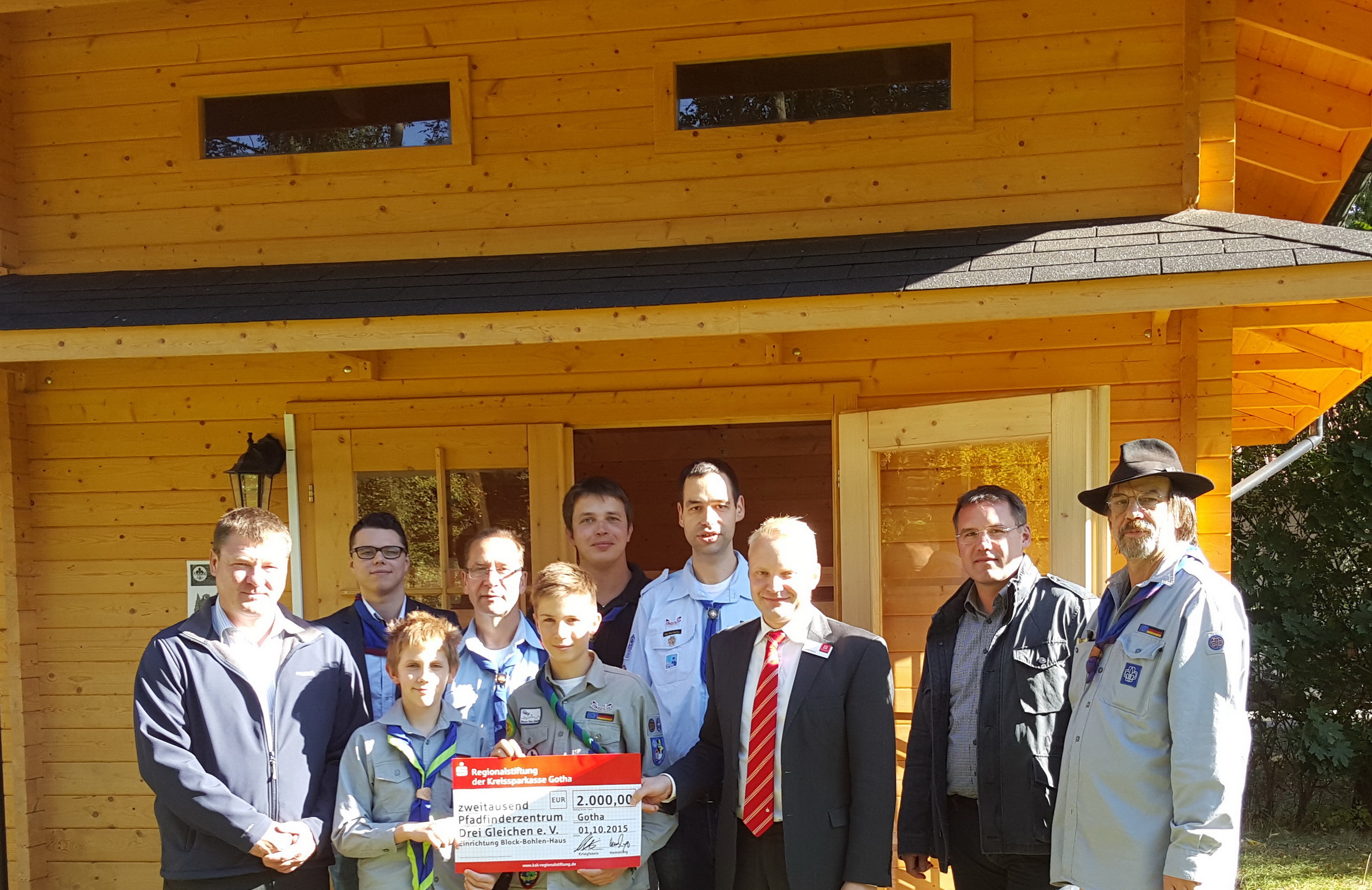 Einen symbolischen Scheck über 2000,- Euro hielten die Pfadfinderinnen und Pfadfinder am 1. Oktober 2015 in ihren Händen. Überbracht wurde dieser im Namen der Regionalstiftung der Kreissparkasse Gotha von Daniel Heinz, dem Filialleiter der Kreissparkasse Gotha. Hinzu kamen noch einmal 250,- Euro, welche Andreas Schreeg, der Ortschaftsbürgermeister der Ortschaft Neudietendorf dem Pfadfinderzentrum Drei Gleichen e.V. übergeben konnte.