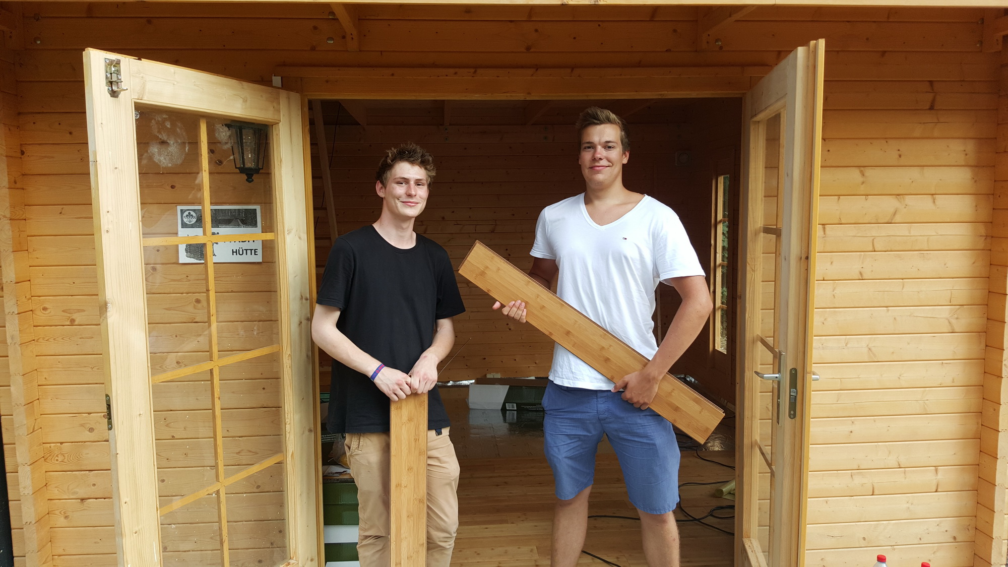 Pfadfinder Nicolas Naumann und Bufdi Hannes Vojtech verlegen Parkett in der "Pfadihütte" des Neudietendorfer Pfadfinderzentrums