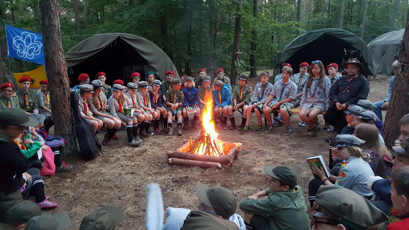 Polnische und Deutsche Pfadfinderinnen und Pfadfinder aus Bydgoszcz und Nesse-Apfelstädt zum Morgenapell im Pfadfinderzentrum Próchnówko