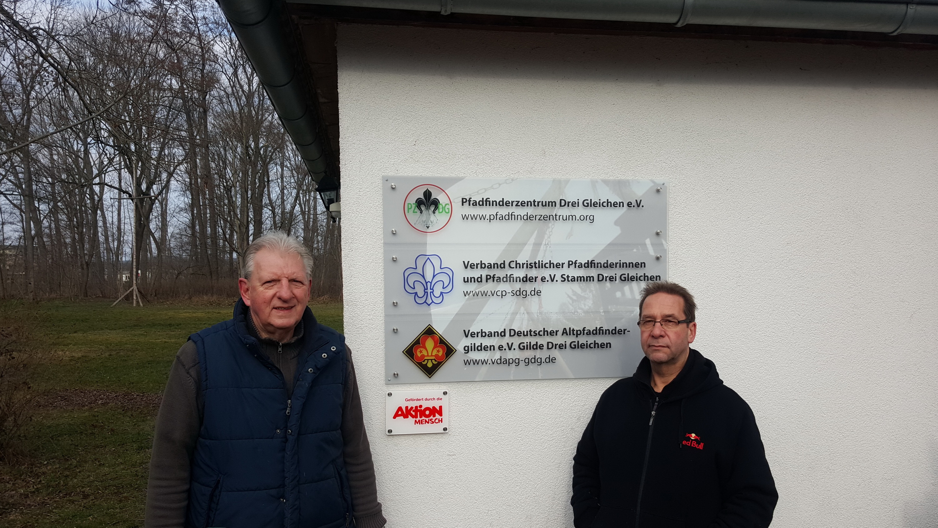 Gestaltet vom Apfelstädter Grafiker Rolf Heinze, der es zusammen mit dem Altpfadfinder Eberhard Knop anbrachte, begrüßt es nun die Gäste der Pfadfinderinnen und Pfadfinder. Der Pfadfinderzentrum Drei Gleichen e.V. als Träger des gleichnamigen Geländes steht dabei weiterhin für zahlreiche Projekte und Aktionen, die er organisiert und durchführt. Der Verband Christlicher Pfadfinderinnen und Pfadfinder e.V. Stamm Drei Gleichen e.V. ist die Ortsgruppe des größten evangelischen Pfadfinderverbandes in Deutschland, der mit seiner Mitgliedschaft in den beiden Weltpfadfinderinnen- und Weltpfadfinderverbänden „World Association of Girl Guides and Girl Scouts“ und „World Organization of the Scout Movement“ eine vielfältige Kinder- und Jugendarbeit in verschiedenen Altersstufen von den Biebern und Wölflingen über die Jungpfadfinder und Pfadfinder bis zu den Ranger und Rovern anbietet. Dabei hat der VCP eine besondere Verbundenheit zu Neudietendorf, da hier 1921 einer der Vorgängerbünde, die Christliche Pfadfinderschaft Deutschlands, im „Wartburghaus“, dem damaligen Sitz des CVJM‘s in der Kirchstraße gegründet worden ist. Der Verband Deutscher Altpfadfindergilden e.V. Gilde Drei Gleichen ist die Ortsgruppe des deutschen Pfadfinderverbandes für die Erwachsenen. Im Weltverband „International Scout and Guide Fellowship“ organisiert, gibt es hier Angebote von gemeinsamen Gildenabenden mit Pizza aus dem Lehmbackofen bis hin zu Aktivitäten, wie die diesjährige Fahrt zu einem Entwicklungshilfeprojekt in Kenia. Natürlich unterstützen die erfahrenen Pfadis auch die Jüngeren und sind Stütze des Pfadfinderzentrums. Mit dem neuen Schild am Eingangsportal des Pfadfinderzentrums, wurde auch ein Schild der Aktion Mensch e.V. angebracht, ohne deren langjährige Förderung der verschiedensten Projekte die Pfadfinderarbeit in Nesse-Apfelstädt so nicht möglich wäre. Hierfür ein großes Dankeschön!