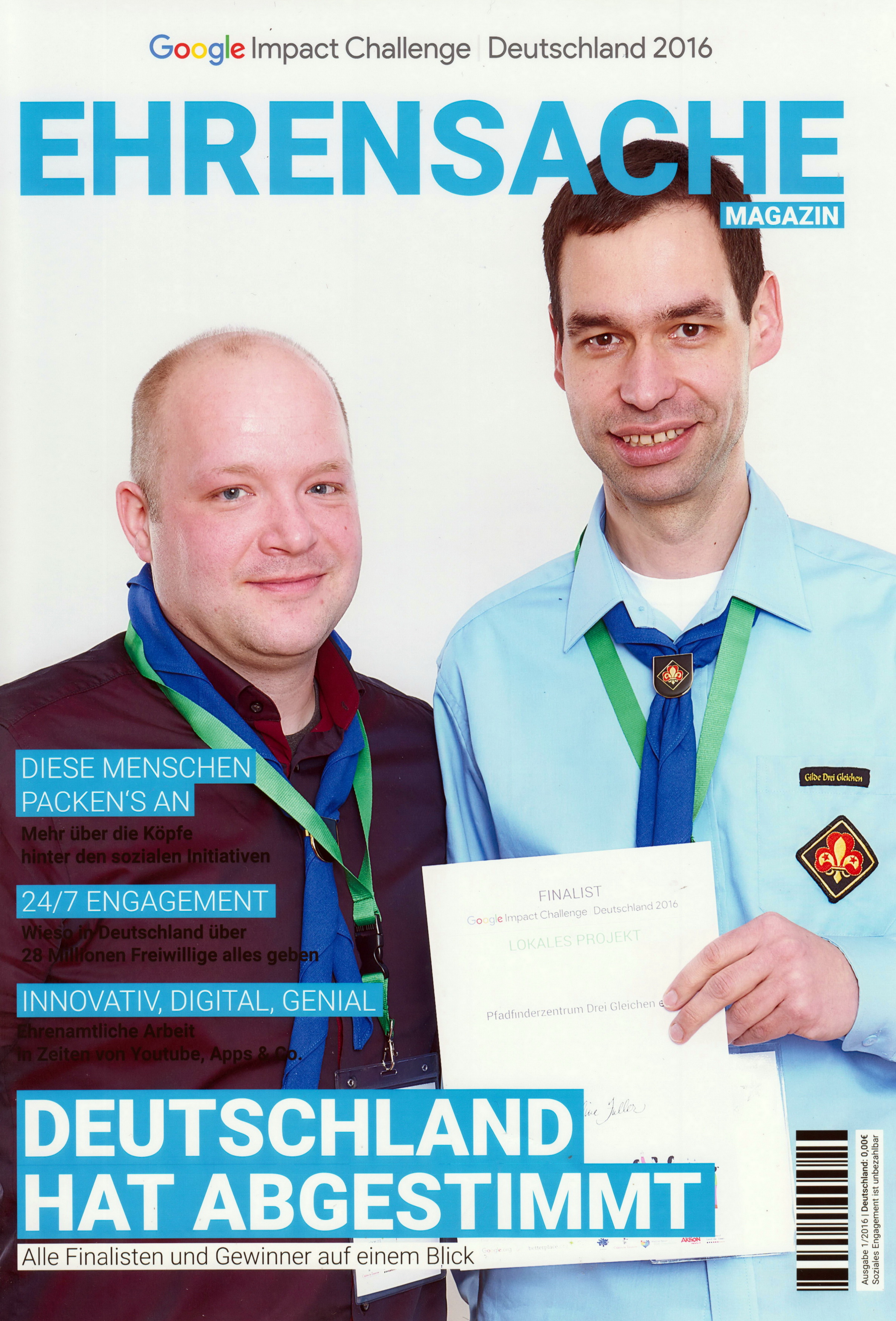 Mit der Idee einer Schnitzeljagd-App schaffte es das Pfadfinderzentrum Drei Gleichen e.V. bis in das Finale der Google Impact Challenge. Unter die 100 Projekte mit den meisten Votings schafften es die Pfadfinderinnen und Pfadfinder jedoch nicht. Dennoch konnten Andreas Roth und Hendrik Knop als Vertreter des Vereins von der Preisverleihung am Abend des 25. Februar 2016 im Berliner Café Moskau, an welcher neben Jacquelline Fuller, der Direktorin von Google.org und Philipp Justus, dem Vizepräsident Google Zentraleuropa auch Arbeits- und Sozialministerin Andrea Nahles teilnahm, 1000 Euro als „Trostpreis“ mit nach Hause nehmen.
