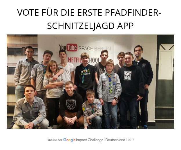 Damit wird insbesondere das hohe gesellschaftliche Engagement als „Lokales Projekt“ honoriert, mit dem es die Pfadfinder schafften unter die 200 besten Ideen von über 2200 Vorschlägen aus ganz Deutschland zu kommen. Diese wurden von der Fachjury, bestehend aus Dr. Gesche Joost (Internetbotschafterin der Bundesregierung), Manuel Neuer (Welttorhüter und Stifter, Manuel Neuer Kids Foundation), Dr. Ann-Kristin Achleitner (Professorin für Entrepreneurial Finance, Technische Universität München), Dr. Ralf Kleindiek (Staatssekretär, Bundesministerium für Familie, Senioren, Frauen und Jugend), Stefanie Graf (Stifterin und Vorstandsvorsitzende, Children for Tomorrow), Esra Küçük (Leiterin Gorki-Forum, Mitglied des Direktoriums Maxim Gorki Theater), Felix Oldenburg (Geschäftsleiter und European Director, Ashoka Deutschland), Dr. Joana Breidenbach (Gründerin und Aufsichtsratsmitglied, betterplace.org) Jacquelline Fuller (Director, Google.org) und Philipp Justus (Vice President, Google Deutschland, Österreich, Schweiz & Zentral- und Osteuropa) ausgewählt. Im Anschluss daran galt es, im Onlineverfahren Stimmen zu sammeln. Trotz der tatkräftigen Unterstützung vieler Helferinnen und Helfer sowie der Presse in ganz Thüringen und darüber hinaus, wofür sich die Pfadfinder bei allen herzlich bedanken, gelang es nicht, unter die ersten 100 Projekte zu kommen und 10.000 Euro für die Umsetzung der Schnitzeljagd-APP zu erhalten. Umso glücklicher sind die Vertreter des Pfadfinderzentrum Drei Gleichen e.V. zusammen mit den Mitgliedern des Verband Christlicher Pfadfinderinnen und Pfadfinder e.V. Stamm Drei Gleichen und der Verband Deutscher Altpfadfindergilden e.V. Gilde Drei Gleichen über das „Trostpflaster“, welches die Arbeit der weltweit größten Kinder- und Jugendbewegung vor Ort gleichermaßen unterstützt und auszeichnet. Den mit einer Fördersumme von 500.000 Euro dotierten „Hauptpreis“ der Google Impact Challange Deutschland 2016 gewann das Leuchtturmprojekt „“Mobile Retter”, dessen smartphone-basiertes System dafür sorgt, dass qualifizierte Ersthelfer schneller am Einsatzort eintreffen und somit Leben retten können.