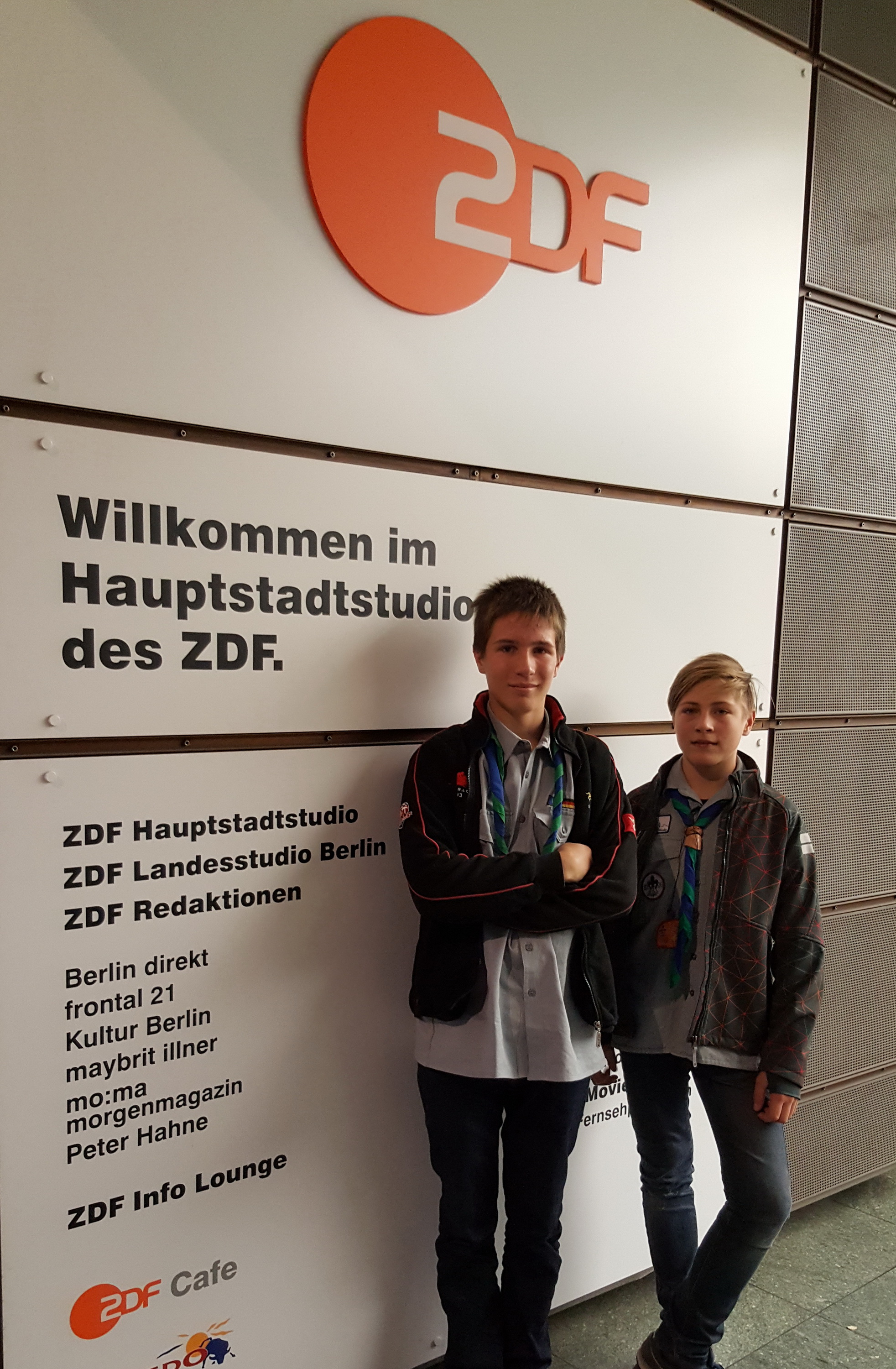 Timon und Vincent (v.l.n.r.) bei einem „Abstecher“ zum Hauptstadtstudio des Zweiten Deutschen Fernsehens (ZDF), dem Träger der Fernsehlotterie „Aktion Mensch“