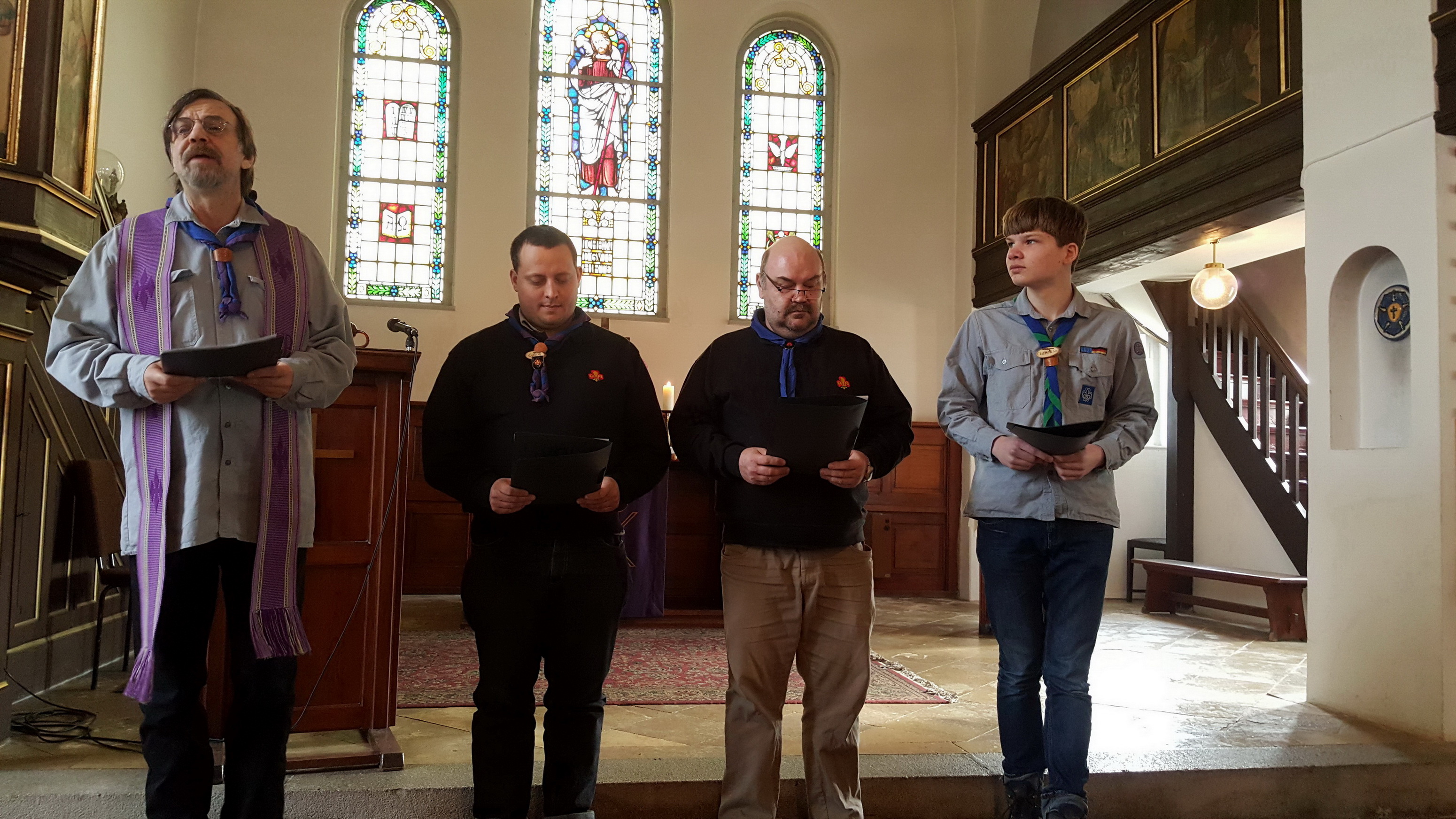 Bereits Montag, dem 22. Februar, am Tag des Thinking Day’s, war die eine oder der andere Pfadfinder in Tracht in der Schule oder an der Arbeit zu sehen gewesen. Den Gedenktag selbst feierten der Verband Christlicher Pfadfinderinnen und Pfadfinder e.V. Stamm Drei Gleichen, der Verband Deutscher Altpfadfindergilden e.V. Gilde Drei Gleichen und das Pfadfinderzentrum Drei Gleichen e.V. am Sonntagvormittag des 28. Februars im Rahmen eines Pfadfindergottesdienstes in der Neudietendorfer Johanniskirche zusammen mit der Gemeinde. Unter dem weltweiten Thema „Connect“ gingen die Pfadfinderinnen und Pfadfinder hier mit ihrem Pfarrer Michael Göring auf die Notwendigkeit der gemeinsamen Zusammenarbeit über Grenzen hinweg, gerade und auch in der Flüchtlingskrise ein. Verdeutlicht wurde dies auch mit dem bekannten Pfadfinderlied „Flinke Hände, Flinke Füße“, welches die Bieber und Wölflinge vorführten und gemeinsam mit den Besuchern der gut gefüllten Kirche sangen. Im Anschluss galt es den doppelten „Pfadfinder-Geburtstag“ mit Kaffee, Tee und von den Pfadis und deren Eltern gebackenen Kuchen im bereits eingedeckten kleinen Saal der Kirche zu feiern. Hier wurden neben der Kirchgemeinde auch Gäste des VCP Stamm St. Georg Region Mulde-Fuhne aus Raguhn in Sachsen-Anhalt begrüßt, welche anlässlich des Tages angereist waren. Den Abschluss der Feierlichkeiten bildete eine Wanderung zum „Kummel-Kreutz“ in Kornhochheim. Hier wurde ein neues Mitglied durch Versprechen und Übergabe des Halstuches zu den Pfadfinderinnen und Pfadfindern aufgenommen. Allen Helferinnen und Helfern, ohne welche dieses Ereignis nicht durchführbar gewesen wäre, gilt ein großes Dankeschön!